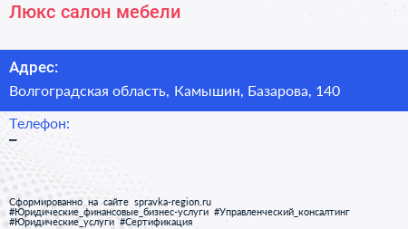 Люкс, салон мебели по адресу Волгоградская область, Камышин, Базарова, 140 в дальнейшем Организация, размещена в следующих категориях: