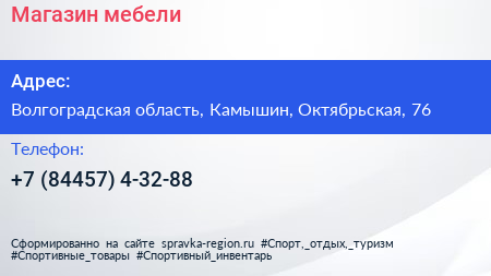 Магазин мебели по адресу Волгоградская область, Камышин, Октябрьская, 76 в дальнейшем Организация, размещена в следующих категориях:
