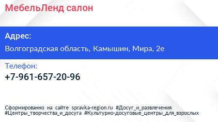 МебельЛенд, салон по адресу Волгоградская область, Камышин, Мира, 2е в дальнейшем Организация, размещена в следующих категориях: