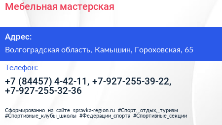 Мебельная мастерская по адресу Волгоградская область, Камышин, Гороховская, 65 в дальнейшем Организация, размещена в следующих категориях: