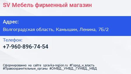 SV-Мебель, фирменный магазин по адресу Волгоградская область, Камышин, Ленина, 7Б/2 в дальнейшем Организация, размещена в следующих категориях: