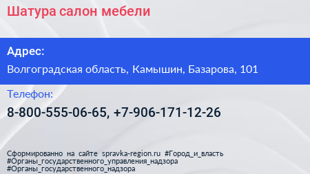 Шатура, салон мебели по адресу Волгоградская область, Камышин, Базарова, 101 в дальнейшем Организация, размещена в следующих категориях: