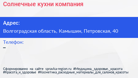 Солнечные кухни, компания по адресу Волгоградская область, Камышин, Петровская, 40 в дальнейшем Организация, размещена в следующих категориях: