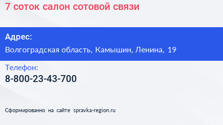 7 соток, салон сотовой связи по адресу Волгоградская область, Камышин, Ленина, 19 в дальнейшем Организация, размещена в следующих категориях: