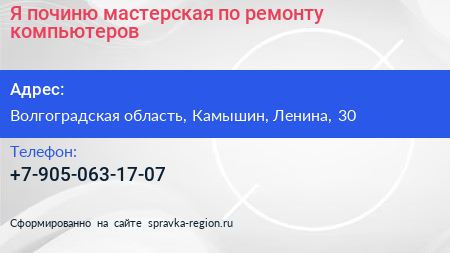 Я починю, мастерская по ремонту компьютеров по адресу Волгоградская область, Камышин, Ленина, 30 в дальнейшем Организация, размещена в следующих категориях: