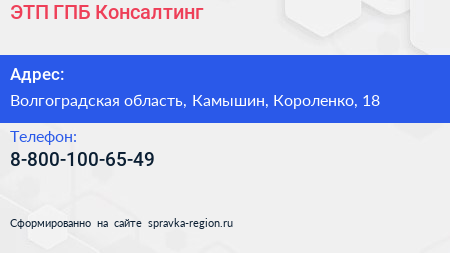 ЭТП ГПБ Консалтинг по адресу Волгоградская область, Камышин, Короленко, 18 в дальнейшем Организация, размещена в следующих категориях: