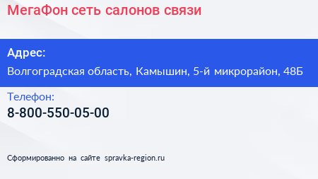 МегаФон, сеть салонов связи по адресу Волгоградская область, Камышин, 5-й микрорайон, 48Б в дальнейшем Организация, размещена в следующих категориях: