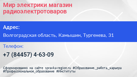 Мир электрики, магазин радиоэлектротоваров по адресу Волгоградская область, Камышин, Тургенева, 31 в дальнейшем Организация, размещена в следующих категориях: