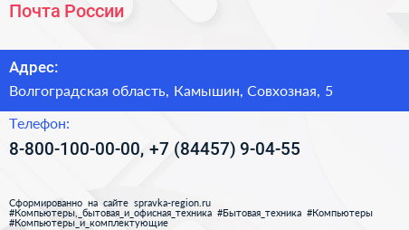 Почта России по адресу Волгоградская область, Камышин, Совхозная, 5 в дальнейшем Организация, размещена в следующих категориях: