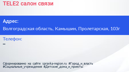 TELE2, салон связи по адресу Волгоградская область, Камышин, Пролетарская, 103г в дальнейшем Организация, размещена в следующих категориях: