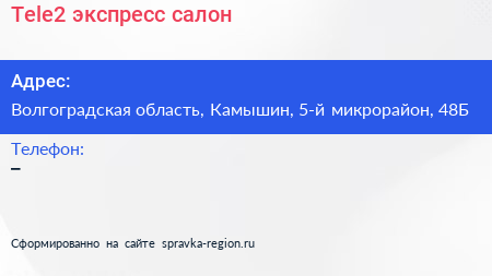 Tele2 экспресс, салон по адресу Волгоградская область, Камышин, 5-й микрорайон, 48Б в дальнейшем Организация, размещена в следующих категориях: