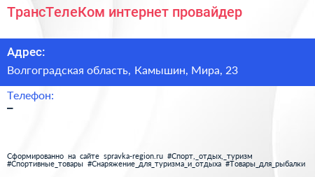 ТрансТелеКом, интернет-провайдер по адресу Волгоградская область, Камышин, Мира, 23 в дальнейшем Организация, размещена в следующих категориях: