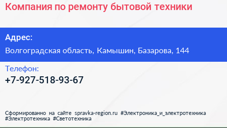 Компания по ремонту бытовой техники по адресу Волгоградская область, Камышин, Базарова, 144 в дальнейшем Организация, размещена в следующих категориях: