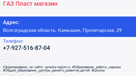 ГАЗ & Пласт, магазин по адресу Волгоградская область, Камышин, Пролетарская, 29 в дальнейшем Организация, размещена в следующих категориях: