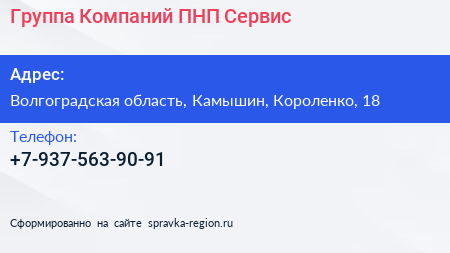 Группа Компаний ПНП-Сервис по адресу Волгоградская область, Камышин, Короленко, 18 в дальнейшем Организация, размещена в следующих категориях: