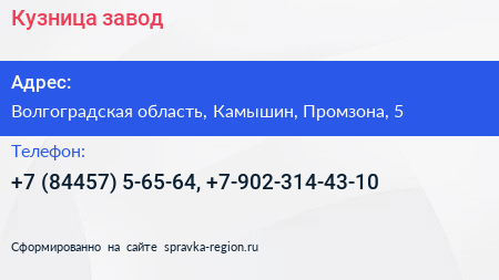 Кузница, завод по адресу Волгоградская область, Камышин, Промзона, 5 в дальнейшем Организация, размещена в следующих категориях:
