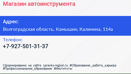 Магазин автоинструмента по адресу Волгоградская область, Камышин, Калинина, 114а в дальнейшем Организация, размещена в следующих категориях: