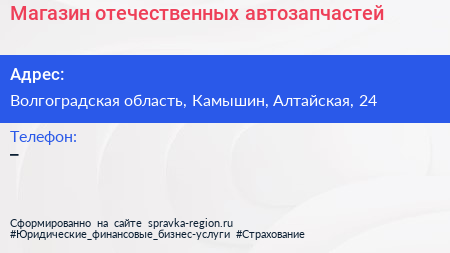 Магазин отечественных автозапчастей по адресу Волгоградская область, Камышин, Алтайская, 24 в дальнейшем Организация, размещена в следующих категориях: