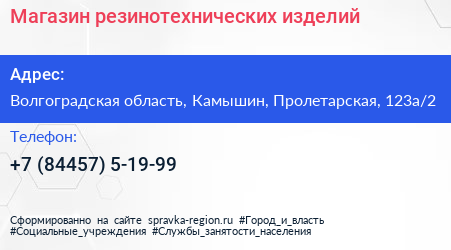 Магазин резинотехнических изделий по адресу Волгоградская область, Камышин, Пролетарская, 123а/2 в дальнейшем Организация, размещена в следующих категориях: