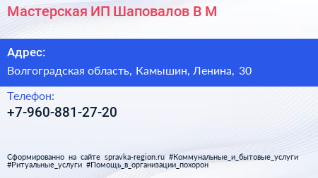 Мастерская, ИП Шаповалов В.М. по адресу Волгоградская область, Камышин, Ленина, 30 в дальнейшем Организация, размещена в следующих категориях: