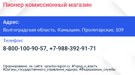 Пионер, комиссионный магазин по адресу Волгоградская область, Камышин, Пролетарская, 109 в дальнейшем Организация, размещена в следующих категориях: