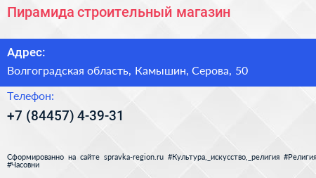 Пирамида, строительный магазин по адресу Волгоградская область, Камышин, Серова, 50 в дальнейшем Организация, размещена в следующих категориях: