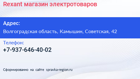 Rexant, магазин электротоваров по адресу Волгоградская область, Камышин, Советская, 42 в дальнейшем Организация, размещена в следующих категориях: