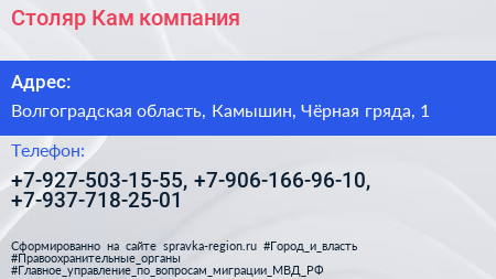 Столяр-Кам, компания по адресу Волгоградская область, Камышин, Чёрная гряда, 1 в дальнейшем Организация, размещена в следующих категориях: