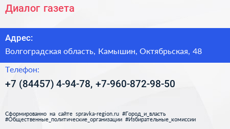 Диалог, газета по адресу Волгоградская область, Камышин, Октябрьская, 48 в дальнейшем Организация, размещена в следующих категориях: