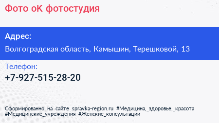 Фото#oK, фотостудия по адресу Волгоградская область, Камышин, Терешковой, 13 в дальнейшем Организация, размещена в следующих категориях: