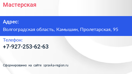Мастерская по адресу Волгоградская область, Камышин, Пролетарская, 95 в дальнейшем Организация, размещена в следующих категориях: