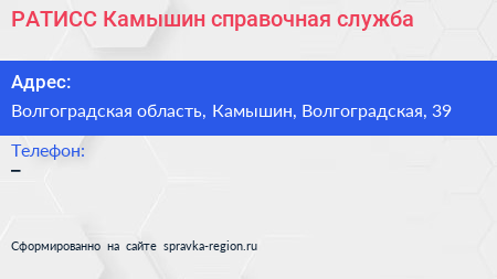 РАТИСС Камышин, справочная служба по адресу Волгоградская область, Камышин, Волгоградская, 39 в дальнейшем Организация, размещена в следующих категориях: