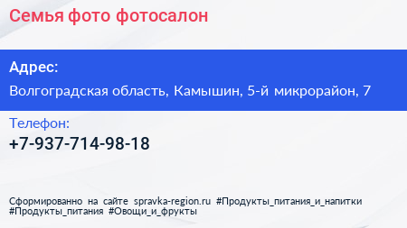 Семья-фото, фотосалон по адресу Волгоградская область, Камышин, 5-й микрорайон, 7 в дальнейшем Организация, размещена в следующих категориях: