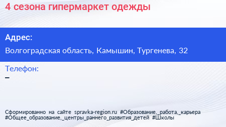 4 сезона, гипермаркет одежды по адресу Волгоградская область, Камышин, Тургенева, 32 в дальнейшем Организация, размещена в следующих категориях: