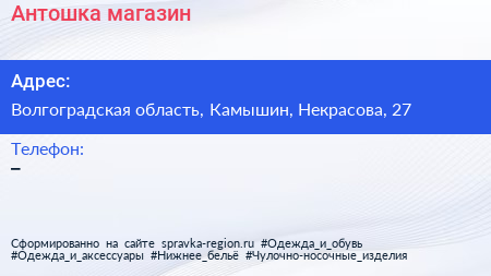 Антошка, магазин по адресу Волгоградская область, Камышин, Некрасова, 27 в дальнейшем Организация, размещена в следующих категориях: