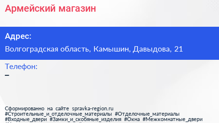 Армейский магазин по адресу Волгоградская область, Камышин, Давыдова, 21 в дальнейшем Организация, размещена в следующих категориях:
