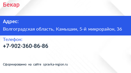 Бекар по адресу Волгоградская область, Камышин, 5-й микрорайон, 36 в дальнейшем Организация, размещена в следующих категориях: