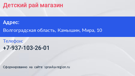 Детский рай, магазин по адресу Волгоградская область, Камышин, Мира, 10 в дальнейшем Организация, размещена в следующих категориях: