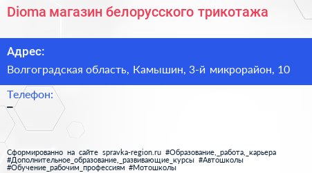 Dioma, магазин белорусского трикотажа по адресу Волгоградская область, Камышин, 3-й микрорайон, 10 в дальнейшем Организация, размещена в следующих категориях:
