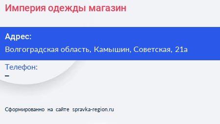 Империя одежды, магазин по адресу Волгоградская область, Камышин, Советская, 21а в дальнейшем Организация, размещена в следующих категориях:
