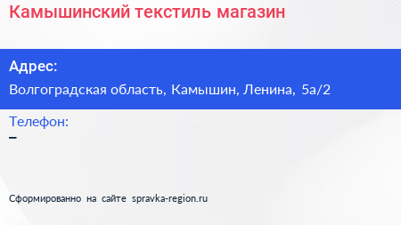 Камышинский текстиль, магазин по адресу Волгоградская область, Камышин, Ленина, 5а/2 в дальнейшем Организация, размещена в следующих категориях: