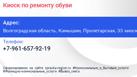Киоск по ремонту обуви по адресу Волгоградская область, Камышин, Пролетарская, 33 киоск в дальнейшем Организация, размещена в следующих категориях:
