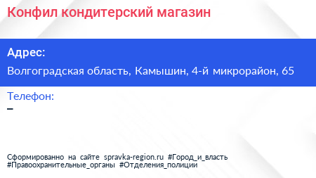Конфил, кондитерский магазин по адресу Волгоградская область, Камышин, 4-й микрорайон, 65 в дальнейшем Организация, размещена в следующих категориях: