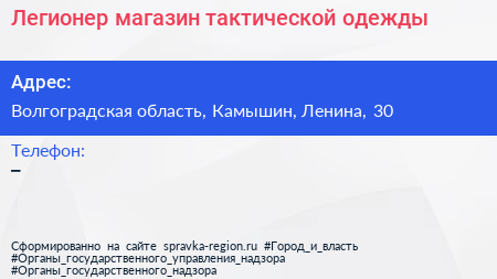 Легионер, магазин тактической одежды по адресу Волгоградская область, Камышин, Ленина, 30 в дальнейшем Организация, размещена в следующих категориях: