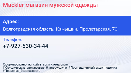 Mackler, магазин мужской одежды по адресу Волгоградская область, Камышин, Пролетарская, 70 в дальнейшем Организация, размещена в следующих категориях: