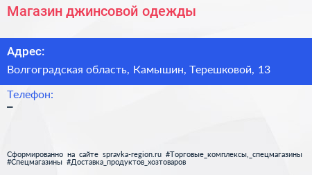 Магазин джинсовой одежды по адресу Волгоградская область, Камышин, Терешковой, 13 в дальнейшем Организация, размещена в следующих категориях: