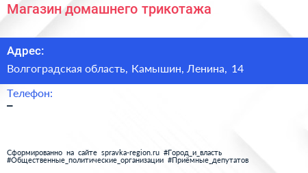 Магазин домашнего трикотажа по адресу Волгоградская область, Камышин, Ленина, 14 в дальнейшем Организация, размещена в следующих категориях: