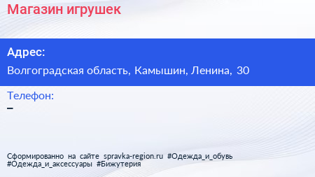 Магазин игрушек по адресу Волгоградская область, Камышин, Ленина, 30 в дальнейшем Организация, размещена в следующих категориях: