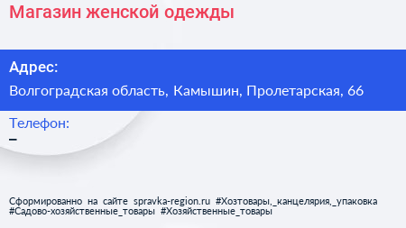 Магазин женской одежды по адресу Волгоградская область, Камышин, Пролетарская, 66 в дальнейшем Организация, размещена в следующих категориях: