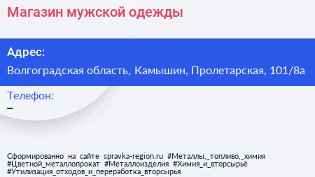 Магазин мужской одежды по адресу Волгоградская область, Камышин, Пролетарская, 101/8а в дальнейшем Организация, размещена в следующих категориях: